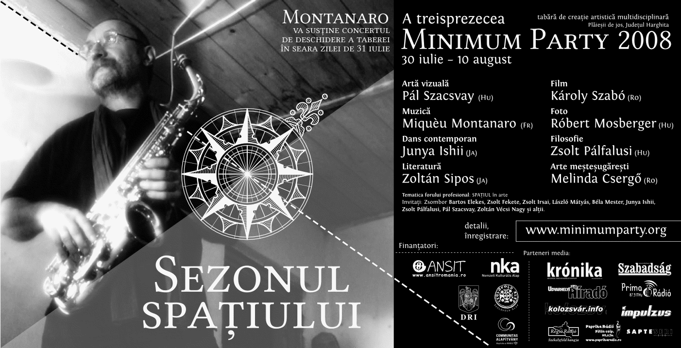 Unele fapte sunt ușor de înțeles, mai ales atunci când argumentele sunt bune. Ochii cuprind cu ușurință unele peisaje, mai ales în cazul în care poziția privitorului este avantajos. Dar este, de asemenea, posibil ca adevărul cuiva să nu poate fi acceptat? Ne întrebăm dacă atitudinea noastră nu va avea consecințe imprevizibile, în timp ce hoinărim prin peisajul nostru mental, în căutarea unui turn de veghe. Dacă spațiul este imens, imaginea lui poate fi interpretat greșit? Poate că sursa imprevizibilității este încrederea în sine falsă a conștiinței, care peregrinează în valea-ntunecată a rațiunii noastre? Este ușor de înțeles greșit ceva, ce pare ușor de acceptat? Este acceptabil dacă am înțeles greșit? Activitatea din acest an în ateliere va analiza ideea de „vom vedea prin oglindă, vag”, în timp ce focul de tabără din centrul cercului nostru va arunca umbre bizar-magice peste marginea difuză a poienii din Casin. Ateliere:Atelier vizualCondus de: Hunor Pető (Budapesta) ConfuziaÎnțelesul greșit (neînțelegera, confuzia, răstălmăcirea) este unul dintre pilonii comunicării umane, care nu este altceva, decât interpretarea defectuoasă a informațiilor primite. În cazul în care informația este un simbol, are o mulțime de conotații atașate la aceasta, care pot determina citirea proastă a semnificației acestor simboluri. De exemplu, dacă vorbim în engleză despre „apple”, în cele mai multe cazuri, ascultătorul va tinde să creadă că vorbim despre un brand, și nu despre un fruct. Pentru a realoca sensul original, acesta trebuie să fie curățat de conotațiile suplimentare, și ca să capete sensuri noi, trebuie să i se adauge ceva. Acel ceva se va formula la atelier, cu ajutorul acelor exemple din istoria artei, care au luat naștere ca urmare a unor confuzii. După aceea vom examina împreună preconcepții și interpretări greșite aduse de participanți „de acasă”, și vom încerca să le facem potrivite pentru discursul profesional. Scopul workshop-ului este, de a pune confuzia în contextul artistic, ca pe o experiență – mai întâi prin modelare și apoi integrându-l în procesul de creație. În acest proces se va folosi alături de tehnicile clasice, și cele ale artei contemporane: land art, instalație, foto și video. Atelier de teatru fizic (corporal)Condus de: Giunia Iși (eng.: Junya Ishii) (Japonia) Copacii, solul, plantele, insectele, animalele sunt entități de sine stătătoare: categoriile care definesc societatea umană (religie, etnie, rasă etc.) nu pot fi atașate naturii. Condiția umană mai păstrează câte ceva din această stare pură de existență, însă astăzi omului îi este frică de natură, pe care în același timp o și respectă. Comunicarea om-natură redevine echilibrată: fiecare are ceva de oferit celuilalt. Scopul atelierului este să fii doar trup și să primești o idee proaspătă de la corpul tău și de la mediul înconjurător. Conducătorul atelierului va sugera unele metode, trasee ale comunicării trupului uman cu natura, fără să ofere soluții explicite. „Este pentru a doua oară când conduc atelierul de teatru fizic de la Minimum Party. Aștept cu nerăbdare să mă întorc cu cortul meu mic aici, în tabără, unde vă voi împărtăși experiența mea, gândurile mele, vă prezint punctul meu de vedere, și, de asemenea, vă voi asculta să învăț câte ceva din modul vostru de gândire. Din 2008 încoace am trecut peste zeci de granițe, am străbătut multe lumi și realități – în căutarea continuă a căii de mijloc a creației…” (Giunia) Atelier fotoCondus de: Zoltán Molnár (Budapesta) Panoramă de benzi desenate, fotomontajPanorama reprezintă un câmp vizual mai larg, mai amplu decât cea cuprinsă de unghiul de vedere uman. Dacă omul ar fi înzestrat cu vedere panoramică, ar putea cuprinde cu privirea întreaga lume înconjurătoare, autosesizându-se în imagine, realizând în consecință ne-însemnătatea existenței sale punctiforme. În anul 1685 Johann Zahn din Würzburg a confecționat un aparat optic care constă dintr-o cutie de lemn cu o lentilă mobilă în spatele căruia inventatorul a plasat o oglindă formând un unghi de 45 de grade, respectiv o sticlă mată pe partea superioară a cutiei pentru fixarea imaginii. Însuși Canaletto, maestrul vedutelor venețiene a folosit cu succes această cameră simplă, strămoșul camerelor optice panoramice. Cu ajutorul camerelor foto rotite orizontal sau vertical, vom crea fotografii panoramice, care vor spune povestea unui personaj cu ajutorul spațiului, peisajului. Vom realiza fotomontaje cu ajutorul luminii, al oglinzilor și al plăcilor de sticlă, fără decupare, lipire sau mascare. Imaginile rezultate par a fi trucate, dar rămân totuși reprezentarea unui spațiu real. Obiecte necesare pentru lucrul în atelier: camera foto (cu film sau digital), trepied, lanternă, bliț, cronometru, oglindă, plăci de sticlă. Atelier videoCondus de: Gergő Fogarasi (Budapesta) și documentar video: Tibor Schneider (Cluj) Sentimente eronate„Într-un final vom fi înghițiți de vârtejul principiilor” (după Émile Zola) Nimic nu este mai firesc decât confuzia. Nimic nu este mai picant decât a călca, a simți strâmb. Păcatul comis cu frică nu mai are nici un sens. Conversația este neînțelegerea însăși. Tăcerea, de asemenea, este un text care poate fi înțeles greșit. Viața umană este un ciclu infinit de neînțelegeri. În acest an vom secționa tema Sentiment/Uitare/Negare, prin intermediul genurilor și structurilor de artă video. Așteptăm de la voi idei, prezentări scurte, povești proprii. Vom căuta colaborarea și cu alte ateliere. În 10 zile de lucru vom parcurge trei etape: